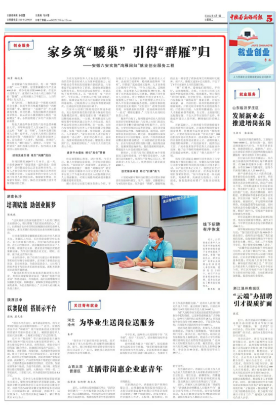 2022年6月7日,《中国劳动保障报》刊登六安市人社局投稿:《家乡筑“暖巢” 引得“群雁”归——安徽六安实施“鸿雁回归”就业创业服务工程》,全文如下: