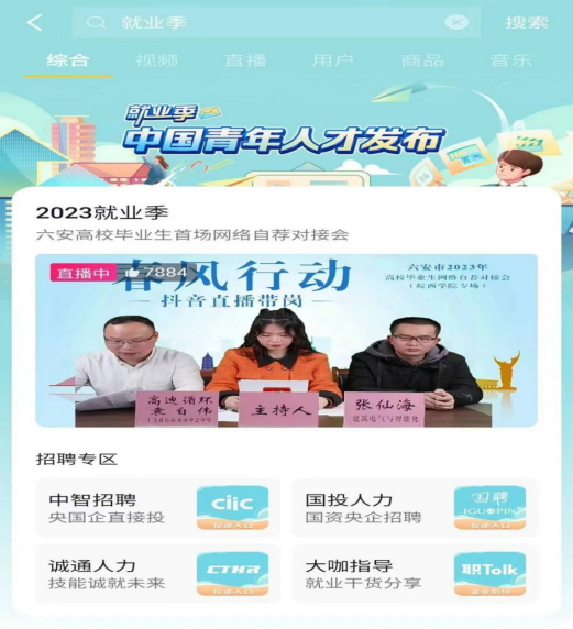 不断创新直播带岗方式,联合企业及高校毕业生开展的“反转招聘”“高校毕业生网络自荐对接会”等活动,被抖音官方推送至2023就业季搜索界面的活动首页。此外市人社局依托六安“鸿雁回归”就业创业服务平台,上线“六安就业”抖音就业招聘小程序,通过开通“就业一键点”,在直播带岗的同时,方便求职者在线查看岗位信息,真正实现“一键投递”。