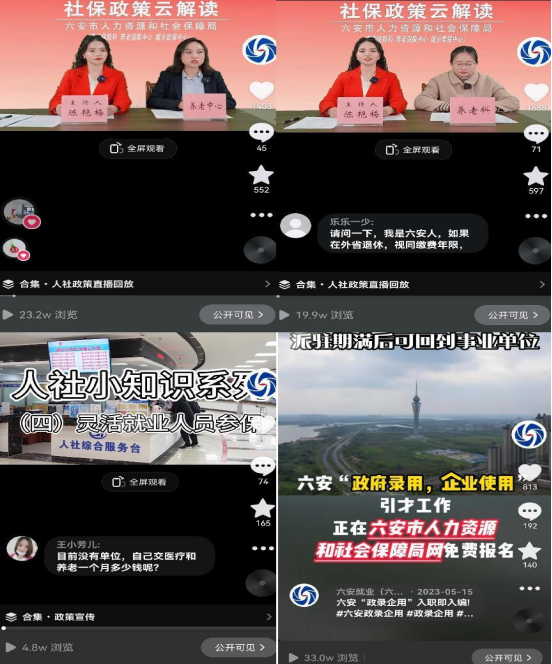 这一年来,“六安就业”抖音号先后创作了一批颇具影响力的作品。推出的“春风行动”直播带岗活动,首播观看量23.2万人次就创下了安徽省政务号观看量第一的好成绩。开展的“社保政策云解读”、“人社小知识”、“政录企用政策推介会”等系列活动,被广大网友高度关注,参与量达到183.6万人次,大大提高了人社政策的宣传力度。