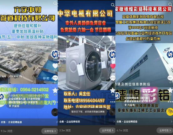 “六安就业”抖音号自开通以来,在摸索中不断总结经验,始终以关注百姓民生、助力就业创业为目标,利用抖音平台海量用户,全方位开展人社政策宣传、直播带岗及就业帮扶。2023年以来“六安就业”抖音账号共发布了 379条作品,开展直播85场,参与企业1.4万余家次,提供就业岗位34万余个,招聘15.2万人,收到简历投递1.8万份,获赞263万次,总曝光量高达715.54万人次,获得群众的一致好评。