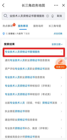 第三步:搜索服务事项 “专业技术人员资格证书管理服务”。