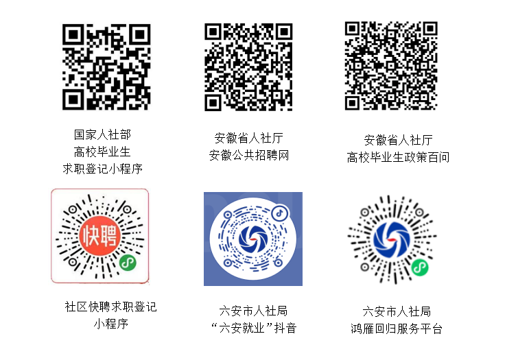求职请参加市县区“周六人才对接”线下招聘活动。登录六安市鸿雁回归平台,关注“社区快聘”小程序,在线投递简历。关注“六安就业”抖音号参加“直播带岗”活动。关注六安市人力资源和社会保障局官网、微信公众号,获取最新信息。