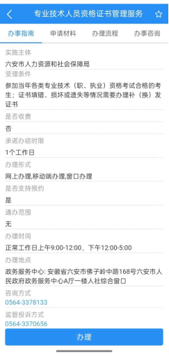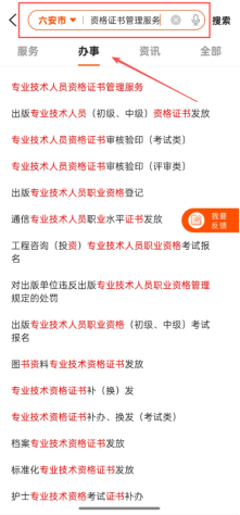2.输入“专业技术人员资格证书管理服务”,选择“办事”模块,点击下方“专业技术人员资格证书管理服务”,选择办事地区“六安市”,点击“去办理”。