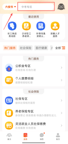 1.打开皖事通APP并登录,定位到“六安市”,点击首页“搜索框”。