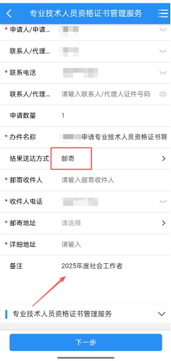 3.“结果送达方式”选择“邮寄”,完善邮寄收件人姓名、电话、地址等信息,在“备注”栏填写拟申领证书的考试年度和名称,如“2025年度社会工作者”,点击“下一步”,最后在跳转的页面中点击“提交申请”即可完成。