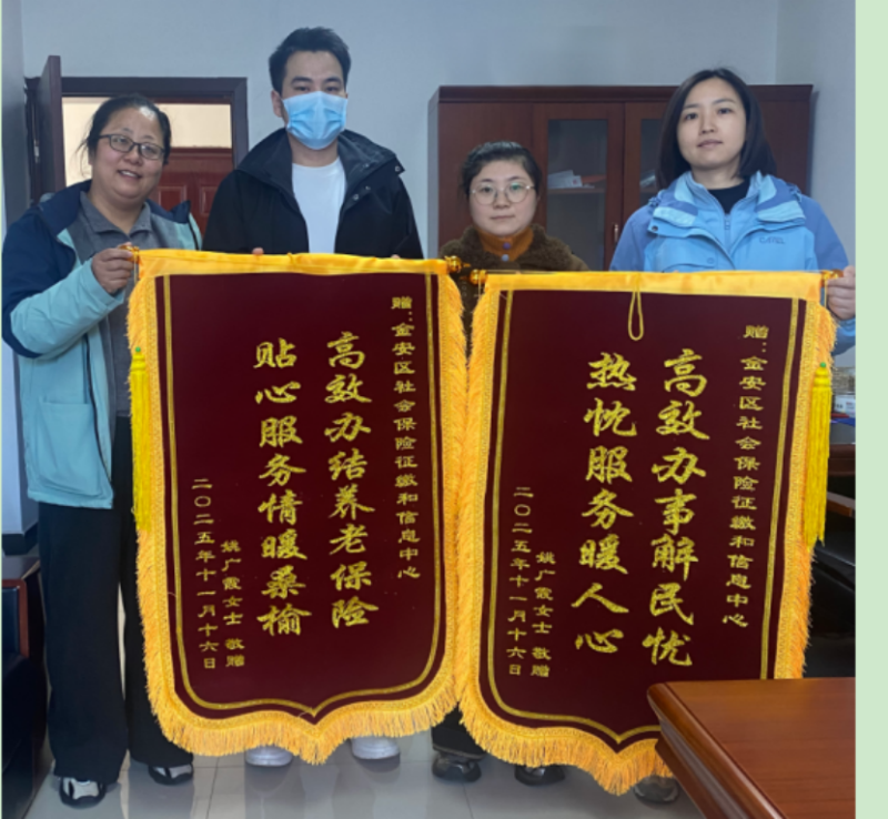一面锦旗映初心,两句赞誉暖人心。2025年11月20日下午,市民姚女士特意委托其家人,将两面饱含感激的锦旗送到金安区人社局征缴和信息中心工作人员的手中。锦旗上印着“高效办事解民忧,热忱服务暖人心”“高效办结养老保险,贴心服务情暖桑榆”的鎏金大字,这不仅是姚女士对人社服务的真挚认可,也是金安区人社局践行“以人民为中心”服务宗旨的生动体现。